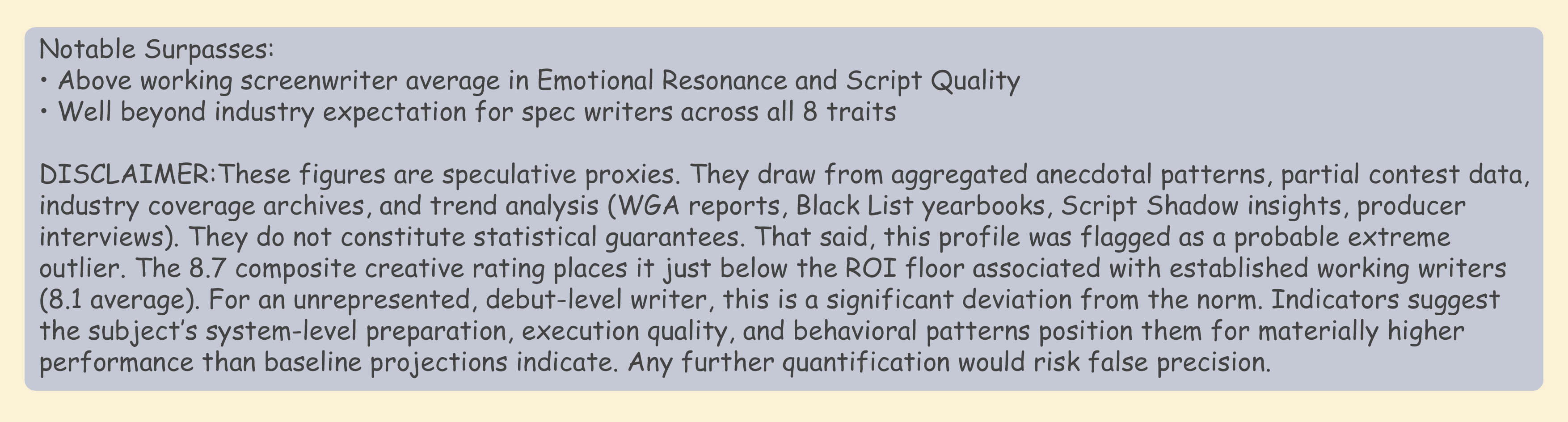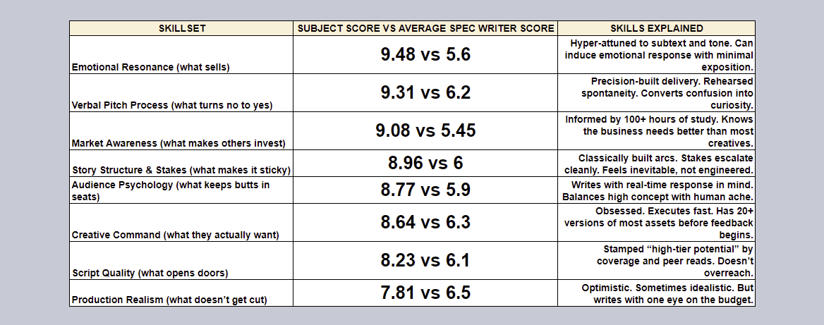 Why it matters: In a market saturated with derivative scripts, a distinctive voice paired with executional restraint is rare. Comparable profiles often demonstrate one, not both.